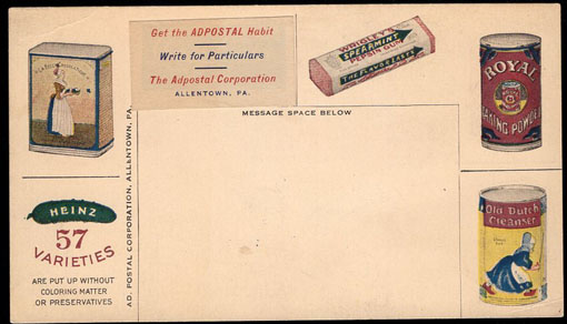 ETATS UNIS (1911) Boîte de levure*. Corn-flakes*. Boîte de soupe de tomates*. Chewing gum*. Superbe entier publicitaire multicolore (N) à 1 cent d'Allentown en Pennsylvanie vendu à « cent, le reste étant financé par les publicités. Ensemble de publicités rare et très difficile à trouver! Le premier entier de ce type que nous rencontrons. Fantastique rareté à ne pas manquer!