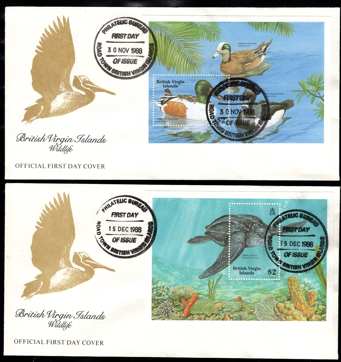 BRITISH VIRGIN ISLANDS (1988) Reptiles. Humpback whale. Ducks. Set of 3 unaddressed FDCs with cachet. Scott Nos 625-30.