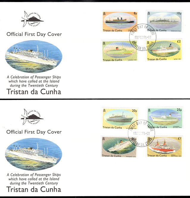 TRISTAN DA CUNHA (1990) Maiden voyage of RMS St. Helena. Set of 2 unaddressed FDCs with cachet. Scott Nos 482-6.