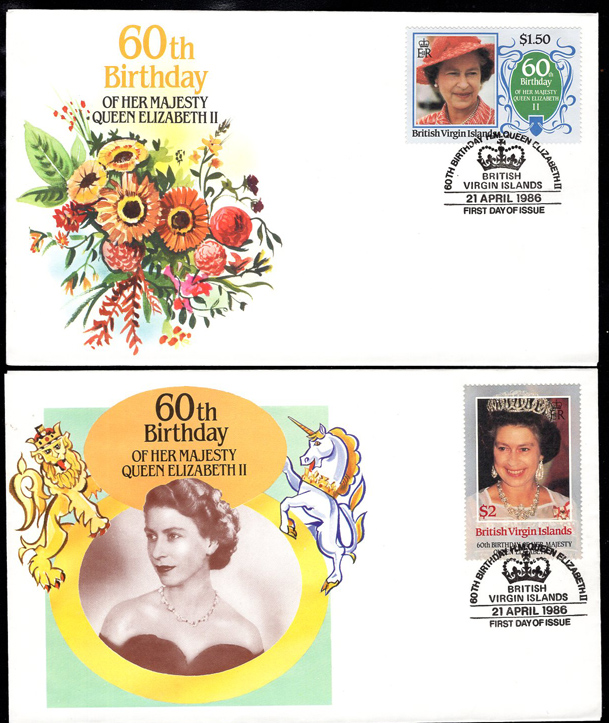 BRITISH VIRGIN ISLANDS (2006) Queen Elizabeth 80th birthday. Set of 2 unaddressed FDCs with cachet. Scott Nos 1066-72.