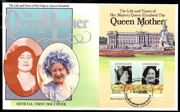 BRITISH VIRGIN ISLANDS (2002) Queen Mother. Set of 2 unaddressed FDCs with cachet. Scott Nos 979-83.