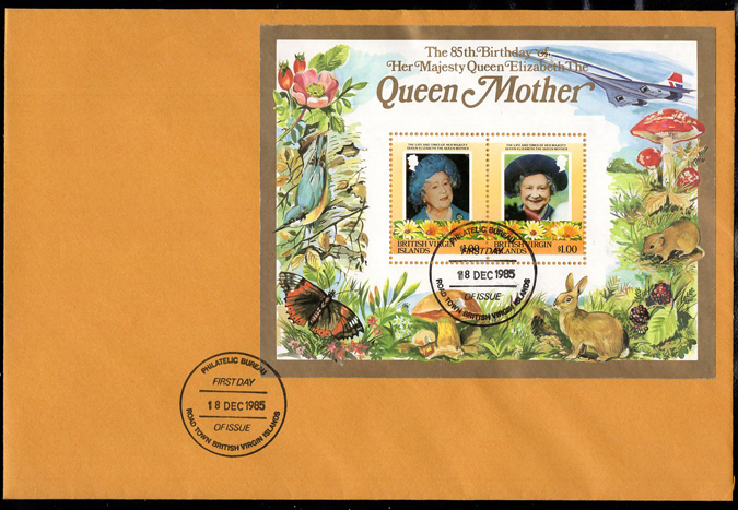 BRITISH VIRGIN ISLANDS (1986) Queen Mother 85th birthday overprinted. Unaddressed FDC with cachet. Scott Nos 5528-31.