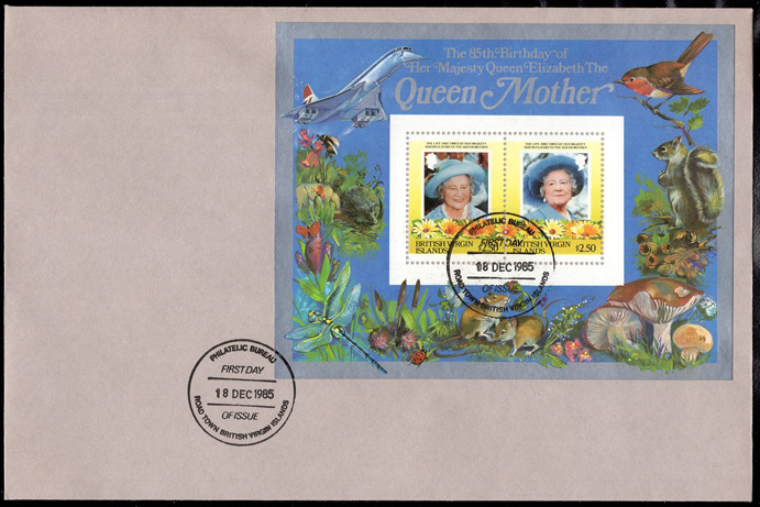 BRITISH VIRGIN ISLANDS (1985) Queen Mother. Set of 5 unaddressed FDCs with cachet. Scott Nos 509-19.