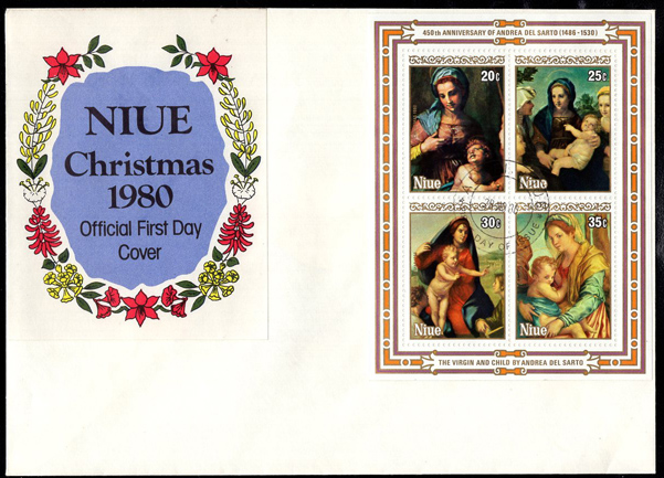 NIUE (1972) Madonna & Child by Murillo. Unaddressed FDC with cachet. Scott No 155.
