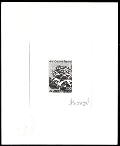 FRANCE (1999) MMe. Caroline Testout rose. Die proof in black signed by the engraver LAVERGNE. Scott No 2726a, Yvert No 3249.
