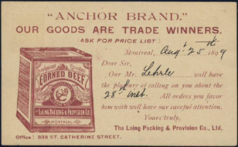 CANADA (1899) Ancre. Sucre. Corned Beef en conserve. Joli Entier Publicitaire (O) Ã 1 cent. "The Laing Packing & Provision Co., Ltd."
