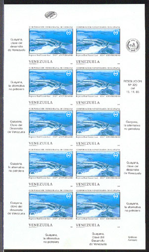 VENEZUELA (1985) Hydro-electric dam. Imperforate sheet of 10 phase proofs lacking value. Scott No 1351, Yvert No 1203.