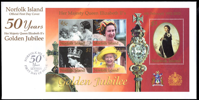 NORFOLK ISLAND (2002) QEII Golden Jubilee. Set of 2 unaddressed FDCs with cachet and thematic cancel. Scott No 758-62.