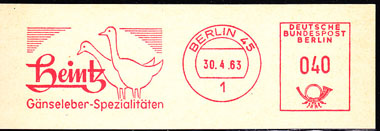 GERMANY (1963) Geese. Red meter cancel on piece. "Heintz Ganseleber-Spezialitaten."