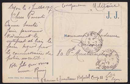 FRANCE (1917) Military hospital. Feldpost postcard with violet handstamp of Hospital Complementaire.