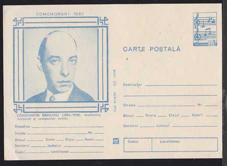 ROMANIA (1983) Constantin Brailoiu*. 1 lei postal card with corner illustration of composer and musicoethnologist.