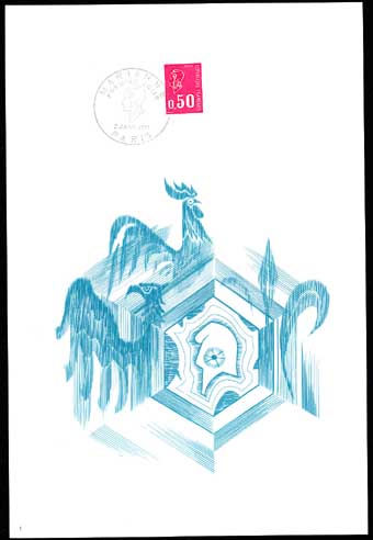FRANCE (1971) Windmill*. Battle of Valmy*. Philatelic First Day document with special engraving thematically related to the stamp and printed description and explanation of the stamp on the reverse. Scott No 1306, Yvert No 1679.